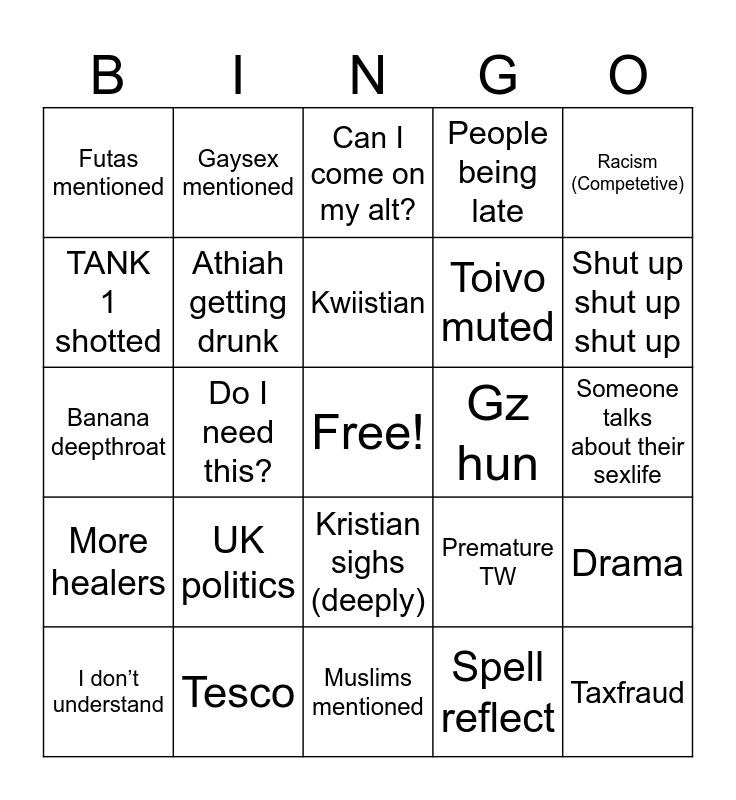 This bingo card has a free space and 24 words: UK politics, Tesco, Kwiistian, I don’t understand, Racism (Competetive), Futas mentioned, TANK 1 shotted, Gaysex mentioned, Gz hun, Kristian sighs (deeply), Toivo muted, Banana deepthroat, Premature TW, Drama, Athiah getting drunk, Spell reflect, Someone talks about their sexlife, Can I come on my alt?, Shut up shut up shut up, Do I need this?, Taxfraud, More healers, People being late and Muslims mentioned.