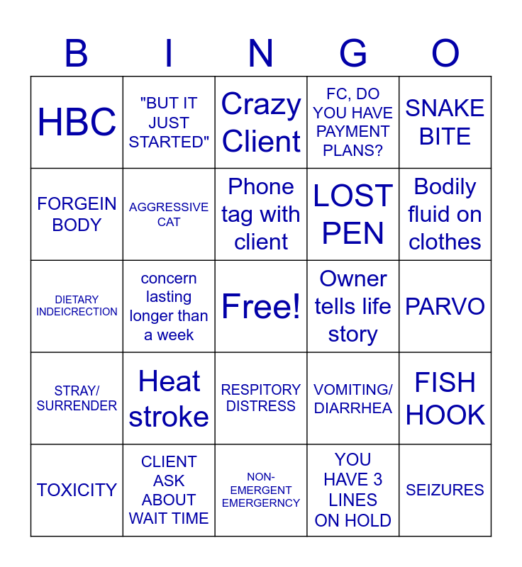 This bingo card has a free space and 24 words: Heat stroke, CLIENT ASK ABOUT WAIT TIME, Phone tag with client, TOXICITY, SNAKE BITE, HBC, FORGEIN BODY, "BUT IT JUST STARTED", Owner tells life story, RESPITORY DISTRESS, LOST PEN, DIETARY INDEICRECTION, VOMITING/ DIARRHEA, FISH HOOK, AGGRESSIVE CAT, YOU HAVE 3 LINES ON HOLD, PARVO, Crazy Client, Bodily fluid on clothes, concern lasting longer than a week, SEIZURES, STRAY/ SURRENDER, FC, DO YOU HAVE PAYMENT PLANS? and NON-EMERGENT EMERGERNCY.
