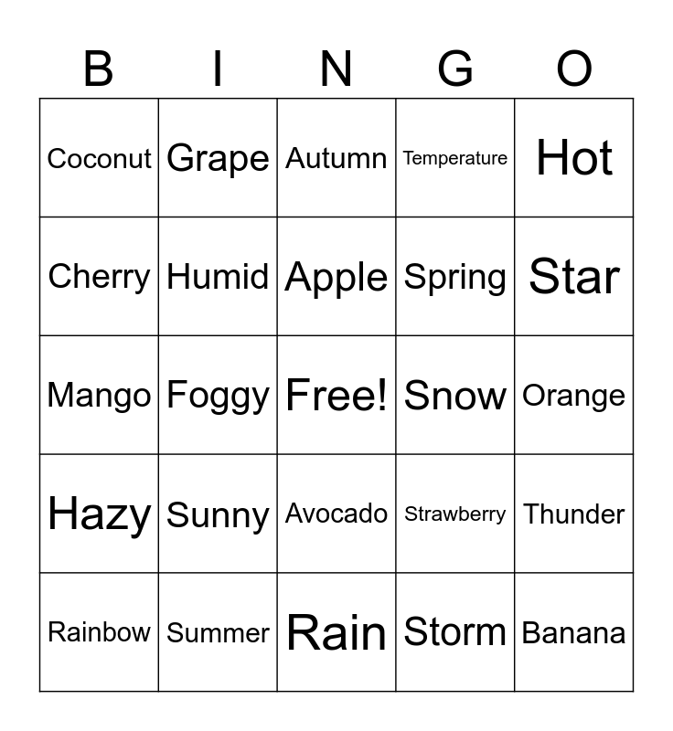 This bingo card has a free space and 24 words: Sunny, Summer, Apple, Rainbow, Hot, Coconut, Cherry, Grape, Snow, Avocado, Spring, Mango, Strawberry, Thunder, Humid, Storm, Orange, Autumn, Star, Foggy, Banana, Hazy, Temperature and Rain.