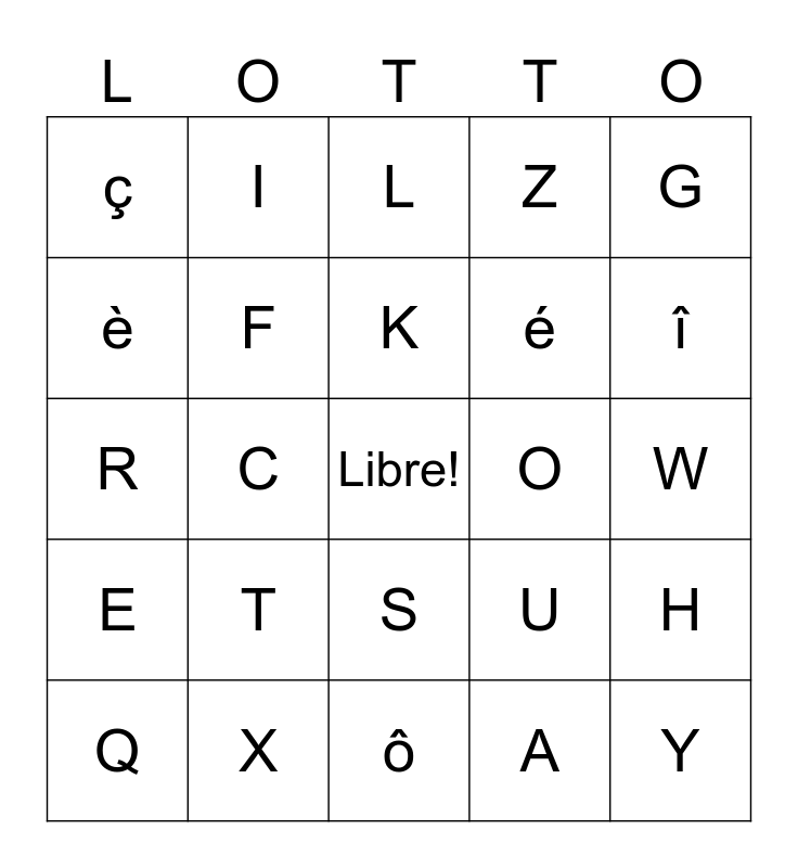 This bingo card has a free space and 32 words: A, B, C, D, E, F, G, H, I, J, K, L, M, N, O, P, Q, R, S, T, U, V, W, X, Y, Z, é, è, ç, ô, ö and î.