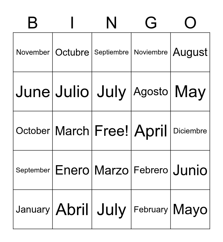 This bingo card has a free space and 24 words: Enero, Abril, July, January, August, November, June, Octubre, April, Marzo, Agosto, October, Febrero, Junio, Julio, February, Diciembre, Septiembre, May, March, Mayo, September, Noviembre and July.