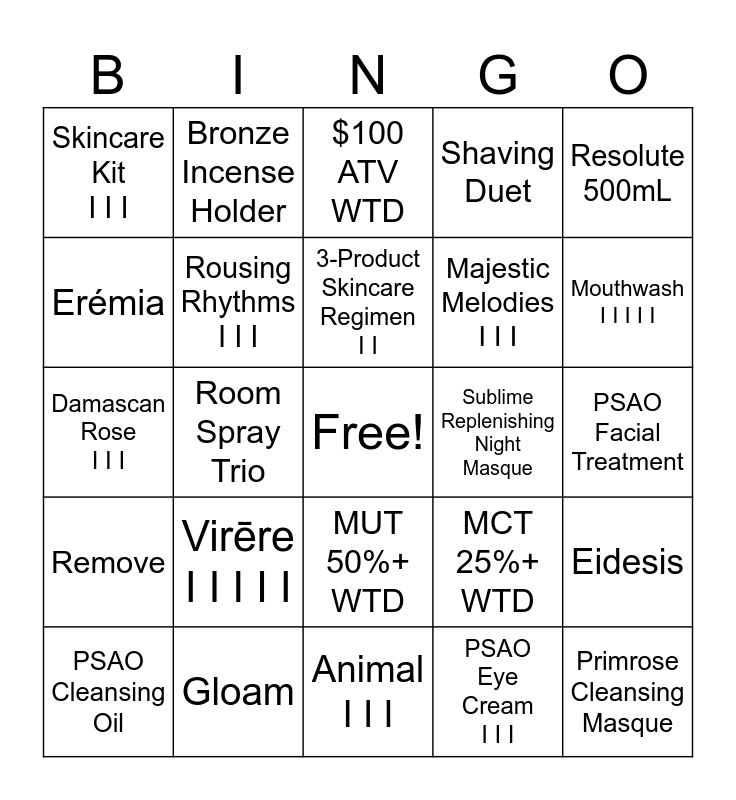 This bingo card has a free space and 24 words: Virēre I I I I I, Gloam, 3-Product Skincare Regimen I I, PSAO Cleansing Oil, Resolute 500mL, Skincare Kit I I I, Erémia, Bronze Incense Holder, Sublime Replenishing Night Masque, MUT 50%+ WTD, Majestic Melodies I I I, Damascan Rose I I I, MCT 25%+ WTD, Eidesis, Rousing Rhythms I I I, PSAO Eye Cream I I I, PSAO Facial Treatment, $100 ATV WTD, Mouthwash I I I I I, Room Spray Trio, Primrose Cleansing Masque, Remove, Shaving Duet and Animal I I I.