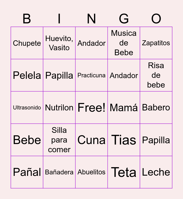 This bingo card has a free space and 45 words: Mecedora, Leche, Juguito, Pañal, Pañalera, Teta, Andador, toallitas, Zapatitos, Bañadera, Musica de Bebe, Mamá, Cuna, Silla para comer, Osito, Abuelitos, Embarazo, Ultrasonido, Abuelitas, Risa de bebe, Huevito, Vasito, Crema, Cobijita, Chupete, Tios, Babero, Chochecito, Ropita, Tias, Bebe, Meme, Papilla, Papá, Luz de Noche, Juguetes, Nutrilon, Termómetro, Leche de formula, Escarpines, Practicuna, Pelela, Andador, Mordillo, Papilla and Cigüeña.