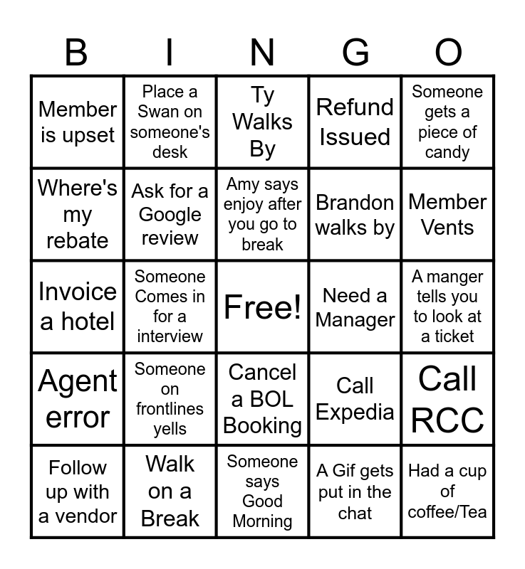 This bingo card has a free space and 24 words: Someone on frontlines yells, Walk on a Break, Amy says enjoy after you go to break, Follow up with a vendor, Someone gets a piece of candy, Member is upset, Where's my rebate, Place a Swan on someone's desk, Need a Manager, Cancel a BOL Booking, Brandon walks by, Invoice a hotel, Call Expedia, Call RCC, Ask for a Google review, A Gif gets put in the chat, A manger tells you to look at a ticket, Ty Walks By, Member Vents, Someone Comes in for a interview, Had a cup of coffee/Tea, Agent error, Refund Issued and Someone says Good Morning.
