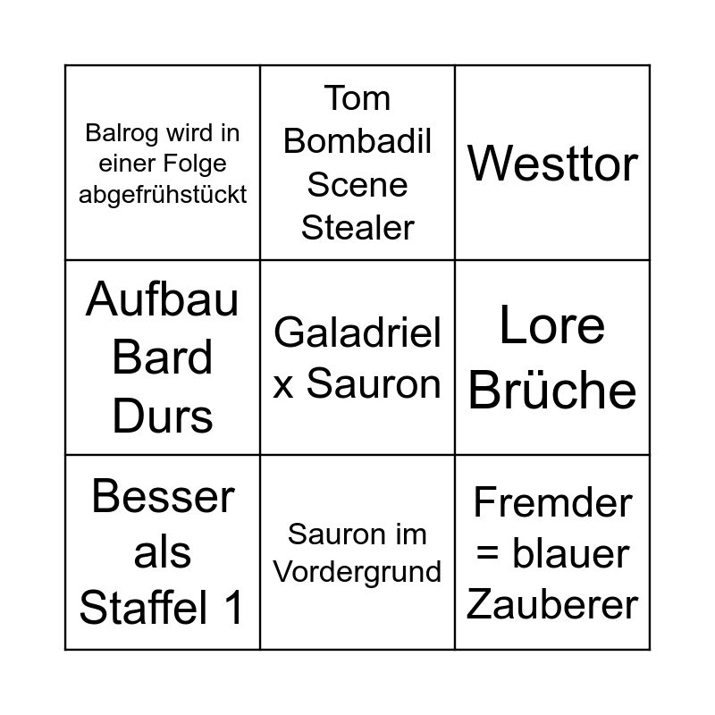 This bingo card has a free space and 8 words: Lore Brüche, Westtor, Tom Bombadil Scene Stealer, Besser als Staffel 1, Balrog wird in einer Folge abgefrühstückt, Fremder = blauer Zauberer, Aufbau Bard Durs and Sauron im Vordergrund.