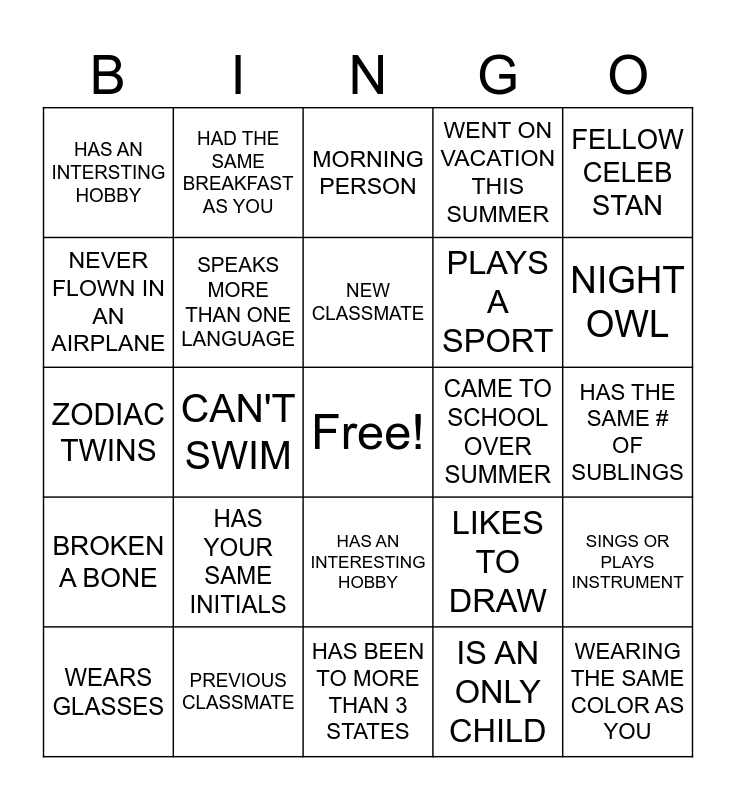 This bingo card has a free space and 24 words: HAS YOUR SAME INITIALS, PREVIOUS CLASSMATE, NEW CLASSMATE, WEARS GLASSES, FELLOW CELEB STAN, HAS AN INTERSTING HOBBY, NEVER FLOWN IN AN AIRPLANE, HAD THE SAME BREAKFAST AS YOU, CAME TO SCHOOL OVER SUMMER, HAS AN INTERESTING HOBBY, PLAYS A SPORT, ZODIAC TWINS, LIKES TO DRAW, SINGS OR PLAYS INSTRUMENT, SPEAKS MORE THAN ONE LANGUAGE, IS AN ONLY CHILD, HAS THE SAME # OF SUBLINGS, MORNING PERSON, NIGHT OWL, CAN'T SWIM, WEARING THE SAME COLOR AS YOU, BROKEN A BONE, WENT ON VACATION THIS SUMMER and HAS BEEN TO MORE THAN 3 STATES.