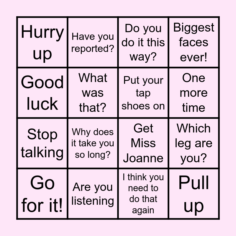 This bingo card has 16 words: Are you listening, Which leg are you?, Do you do it this way?, Hurry up, Stop talking, Have you reported?, Get Miss Joanne, I think you need to do that again, Good luck, What was that?, Go for it!, Biggest faces ever!, Why does it take you so long?, One more time, Put your tap shoes on and Pull up.