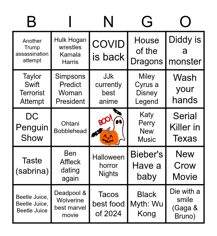This bingo card has a free space and 24 words: Ben Affleck dating again, Deadpool & Wolverine best marvel movie, JJk currently best anime, Beetle Juice, Beetle Juice, Beetle Juice, Diddy is a monster, Another Trump assassination attempt, Taylor Swift Terrorist Attempt, Hulk Hogan wrestles Kamala Harris, Katy Perry New Music, Halloween horror Nights, Miley Cyrus a Disney Legend, DC Penguin Show, Bieber's Have a baby, New Crow Movie, Simpsons Predict Woman President, Black Myth: Wu Kong, Serial Killer in Texas, COVID is back, Wash your hands, Ohtani Bobblehead, Die with a smile (Gaga & Bruno), Taste (sabrina), House of the Dragons and Tacos best food of 2024.
