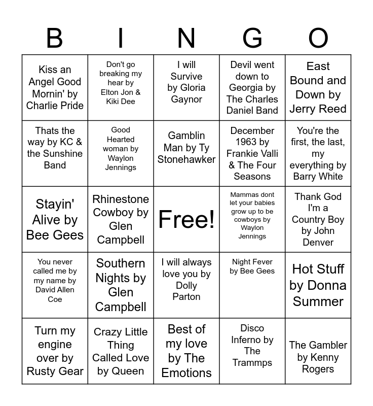This bingo card has a free space and 39 words: Long Haired Country Coy by The Charles Daniel Band, Louisianna Woman by Conway Twitty, Rocky Mountain High by John Denver Turn my engine over by Rusty Gear, Good Hearted woman by Waylon Jennings, Turn my engine over by Rusty Gear, I will always love you by Dolly Parton, Gamblin Man by Ty Stonehawker, Coal Miners Daughter by Lorette Lynn, East Bound and Down by Jerry Reed, You never called me by my name by David Allen Coe, Rhinestone Cowboy by Glen Campbell, Devil went down to Georgia by The Charles Daniel Band, The Gambler by Kenny Rogers, Thank God I'm a Country Boy by John Denver, Mammas dont let your babies grow up to be cowboys by Waylon Jennings, Southern Nights by Glen Campbell, Take it Easy by the eagles, Kiss an Angel Good Mornin' by Charlie Pride, Jolene by Dolly Parton, Night Fever by Bee Gees, Thats the way by KC & the Sunshine Band, Best of my love by The Emotions, December 1963 by Frankie Valli & The Four Seasons, You're the first, the last, my everything by Barry White, We are Family by Sister Sledge, Love really hurts without you by Billy Ocean, Superstition by Stevie Wonder, Love is in the air by John Paul Young, September by Earth, Wind & Fire, Don't go breaking my hear by Elton Jon & Kiki Dee, Boogie Wonderland by Earth Wind & Fire, Blame it on the Boogie by The Jacksons, I will Survive by Gloria Gaynor, Crazy Little Thing Called Love by Queen, Disco Inferno by The Trammps, You're the one that I want by John Travolta & Olivia John-Newton, Hot Stuff by Donna Summer, Stayin' Alive by Bee Gees and I don't wanna be right by Barbara Mandrell.