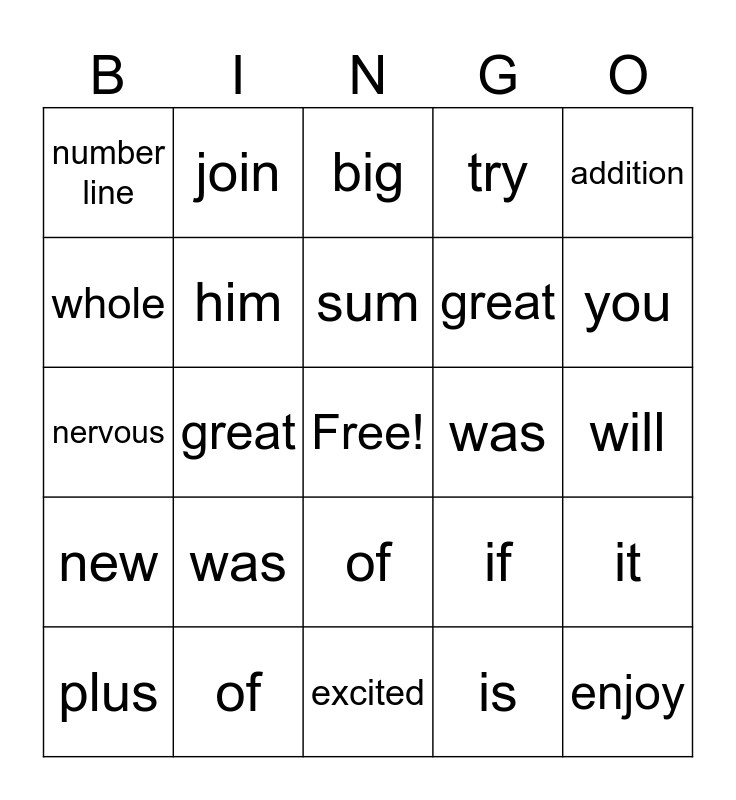 This bingo card has a free space and 24 words: was, of, sum, plus, addition, number line, whole, join, was, of, great, nervous, if, it, him, is, will, big, you, great, enjoy, new, try and excited.