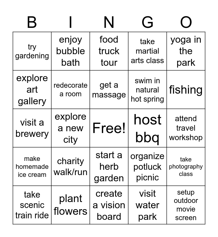 This bingo card has a free space and 87 words: jet skiiing, attend cultural fair, start a herb garden, attend food festival, stargazing, morning run, stay at a bed and breakfast, bike ride, go for a swim, take a dance class, visit a botanical garden, day off just for yourself, take photography class, attend travel workshop, start summer scrapbook, get a massage, outdoor pilates, try fitness class, camping trip, attend outdoor concert, spend day without technology, visit theme park, visit a brewery, wine tasting, visit water park, drive-in movie, kayaking, write in a journal, take pottery class, try new restaurant, plant flowers, visit new country, take nature walk, charity walk/run, explore art gallery, rock climbing, fishing, build a treehouse, make homemade lemonade, explore a new city, snorkeling or scuba diving, weekend getaway, go backpacking, host bbq, take a roadtrip, yoga in the park, read book by the pool, enjoy bubble bath, day at the beach, meditation retreat, host a garage sale, explore local attractions, make homemade ice cream, listen to a podcast, start a blog, participate in historical reenactment, swim in natural hot spring, join sports league, zip-lining, take martial arts class, redecorate a room, visit historical landmark, make a DYI project, practice mindfulness, sailing lesson, windsurfing, build backyard fire pit, take scenic train ride, setup outdoor movie screen, beach bonfire, organize yard game tournament, boat tour, food truck tour, organize potluck picnic, whitewater rafting, explore new neighborhood, attend theatre production, create a vision board, take cooking class, visit a museum, spa day at home, try paddleboarding, attend summer festival, learn to play musical instrument, trying painting class, try gardening and visit farmer's market.