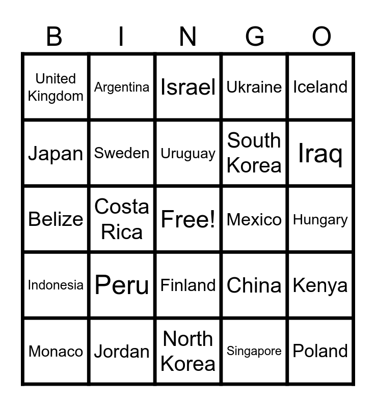 This bingo card has a free space and 39 words: Canada, USA, Italy, Sweden, Monaco, Finland, Uruguay, Paraguay, Iceland, Indonesia, Costa Rica, Ukraine, Poland, Hungary, Mexico, Peru, Ireland, United Kingdom, India, China, Japan, North Korea, South Korea, Iraq, United Arab Emirates, Australia, Cuba, France, Belgium, Argentina, Brazil, Rwanda, Israel, Jordan, Singapore, Malawi, Kenya, Belize and Switzerland.