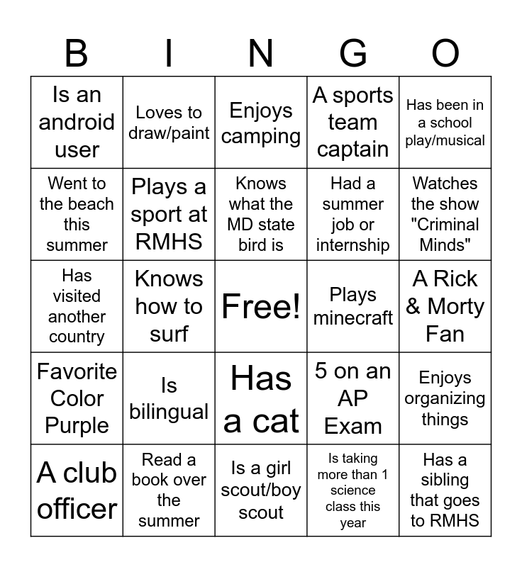 This bingo card has a free space and 29 words: A club officer, Flew on an airplane this summer, Knows how to surf, A chorus, band, or orchestra member, Is an android user, Enjoys camping, Plays a sport at RMHS, Is bilingual, Plays minecraft, Read a book over the summer, A Rick & Morty Fan, Has a sibling that goes to RMHS, Is a girl scout/boy scout, Is taking more than 1 science class this year, Watches the show "Criminal Minds", Loves Chipotle, Has a cat, Favorite Color Purple, Has been in a school play/musical, Has visited another country, 5 on an AP Exam, A spring sports athlete, Had a summer job or internship, Went to the beach this summer, A sports team captain, Loves to draw/paint, Enjoys organizing things, Knows what the MD state bird is and Enjoys baking as a hobby.