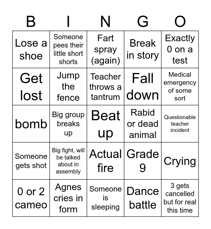 This bingo card has a free space and 24 words: Big fight, will be talked about in assembly, Agnes cries in form, Teacher throws a tantrum, 0 or 2 cameo, Exactly 0 on a test, Lose a shoe, Get lost, Someone pees their little short shorts, Rabid or dead animal, Actual fire, Fall down, bomb, Grade 9, Crying, Jump the fence, Dance battle, Questionable teacher incident, Fart spray (again), Medical emergency of some sort, Big group breaks up, 3 gets cancelled but for real this time, Someone gets shot, Break in story and Someone is sleeping.