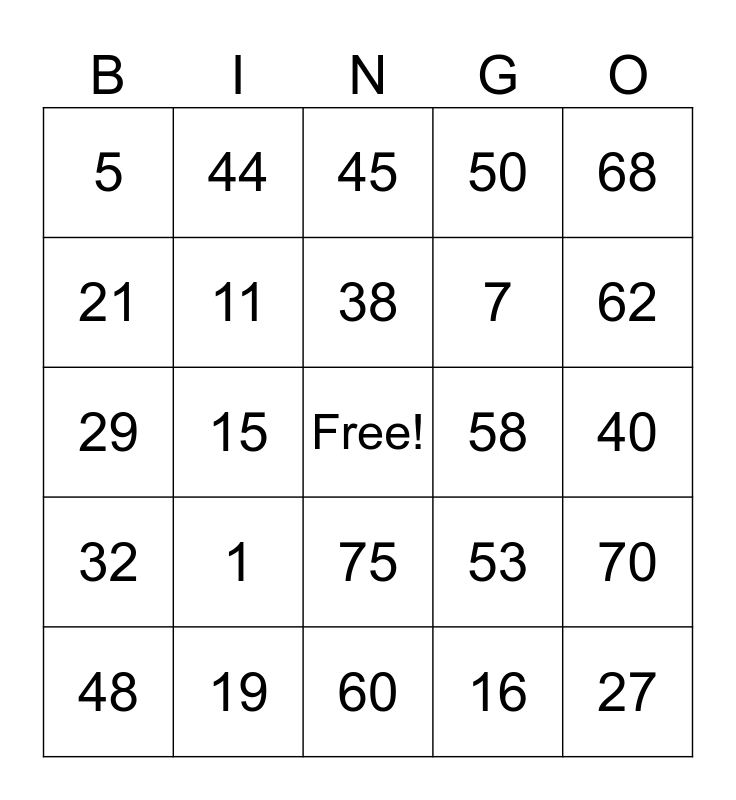 This bingo card has a free space and 24 words: 1, 19, 38, 48, 68, 5, 21, 44, 58, 75, 7, 29, 53, 70, 11, 16, 40, 45, 62, 15, 27, 32, 50 and 60.