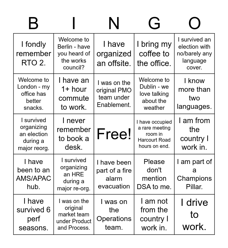 This bingo card has a free space and 24 words: I survived organizing an HRE during a major re-org., I was on the original market team under Product and Process., I was on the original PMO team under Enablement., I have survived 6 perf seasons., I survived an election with no/barely any language cover., I fondly remember RTO 2., Welcome to London - my office has better snacks., Welcome to Berlin - have you heard of the works council?, I have occupied a rare meeting room in Harcourt Road hours on end., I have been part of a fire alarm evacuation, Welcome to Dublin - we love talking about the weather, I survived organizing an election during a major reorg., Please don't mention DSA to me., I am part of a Champions Pillar., I have an 1+ hour commute to work., I am not from the country I work in., I am from the country I work in., I have organized an offsite., I know more than two languages., I never remember to book a desk., I drive to work., I have been to an AMS/APAC hub., I bring my coffee to the office. and I was on the Operations team..