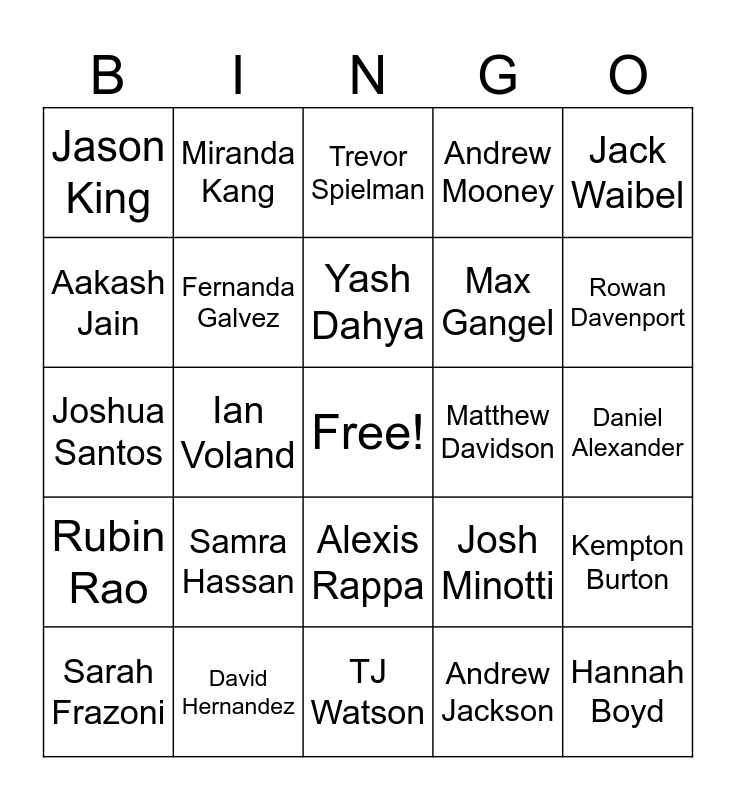 This bingo card has a free space and 44 words: Laura Latt, Hannah Boyd, Pranav Parakala, Sarah Frazoni, Alex Hung, Andrew Jackson, Trevor Spielman, Juan Durante, Jack Waibel, David Hernandez, Andrew Mooney, Matthew Davidson, Alexis Rappa, Samra Hassan, Riley Peterson, TJ Watson, Harsheet Kumm, Joshua Santos, Pete Sumethasorn, Rowan Davenport, Miranda Kang, Garrett Squires, Jae-son Rivera, Jason King, Wyatt Potts, Daniel Alexander, Casey Coen, Jacob Calhoun, Josh Minotti, Rubin Rao, Eric Guzman, Kempton Burton, Jake Nunn, Rajarshi Bose, Ian Voland, Jake Foxhoven, Samiran Muli, Ethen Tajada, Yash Dahya, Aakash Jain, Max Gangel, Megan Clark, Fernanda Galvez and Eliot Nychka.
