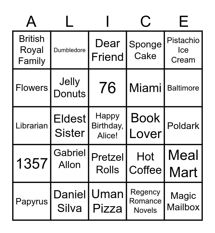 This bingo card has a free space and 24 words: Gabriel Allon, Daniel Silva, 76, Papyrus, Pistachio Ice Cream, British Royal Family, Flowers, Dumbledore, Book Lover, Pretzel Rolls, Miami, Librarian, Hot Coffee, Meal Mart, Jelly Donuts, Regency Romance Novels, Poldark, Dear Friend, Baltimore, Eldest Sister, Magic Mailbox, 1357, Sponge Cake and Uman Pizza.