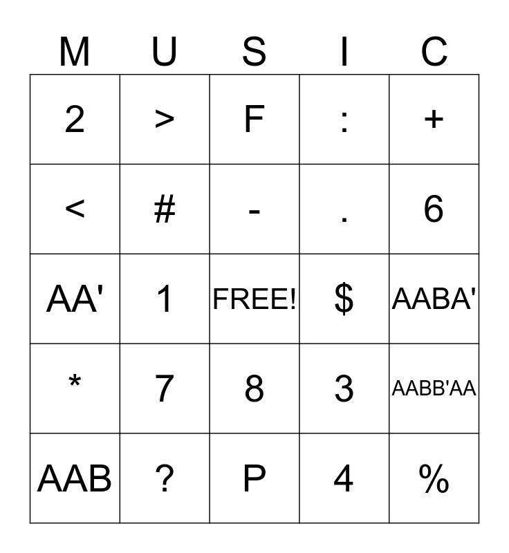 This bingo card has a free space and 31 words: P, !, 1, @, 2, F, #, 3, $, 4, AABA', %, 5, ^, 6, &, AABB'AA, 7, *, 8, +, ~, AAB, >, ., <, :, AA', ?, - and =.