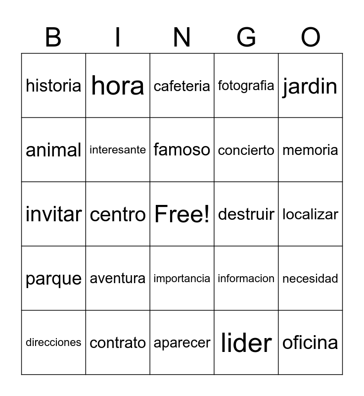 This bingo card has a free space and 24 words: aventura, contrato, famoso, direcciones, jardin, historia, animal, hora, destruir, importancia, concierto, invitar, informacion, necesidad, interesante, lider, localizar, cafeteria, memoria, centro, oficina, parque, fotografia and aparecer.