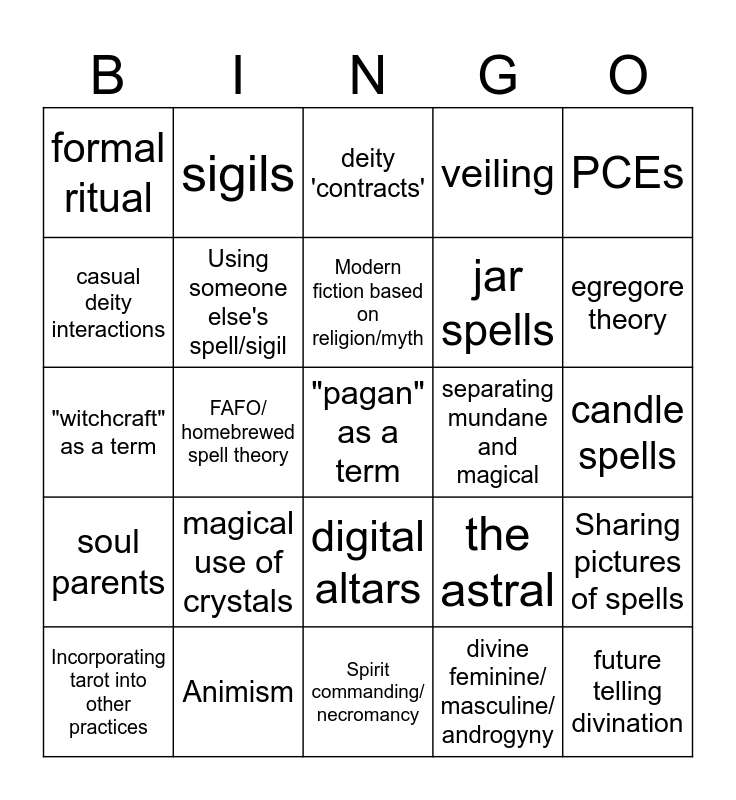 This bingo card has a free space and 24 words: magical use of crystals, Animism, Modern fiction based on religion/myth, Incorporating tarot into other practices, PCEs, formal ritual, casual deity interactions, sigils, separating mundane and magical, digital altars, jar spells, "witchcraft" as a term, the astral, Sharing pictures of spells, Using someone else's spell/sigil, divine feminine/ masculine/ androgyny, candle spells, deity 'contracts', egregore theory, FAFO/ homebrewed spell theory, future telling divination, soul parents, veiling and Spirit commanding/ necromancy.