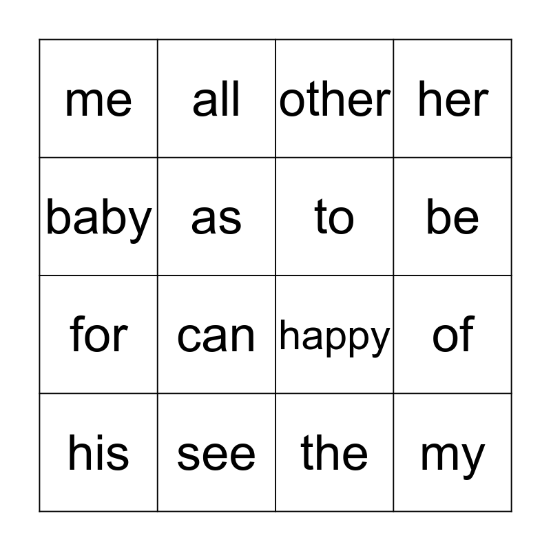 This bingo card has a free space and 15 words: his, my, other, me, be, baby, can, the, as, for, of, her, to, all and see.