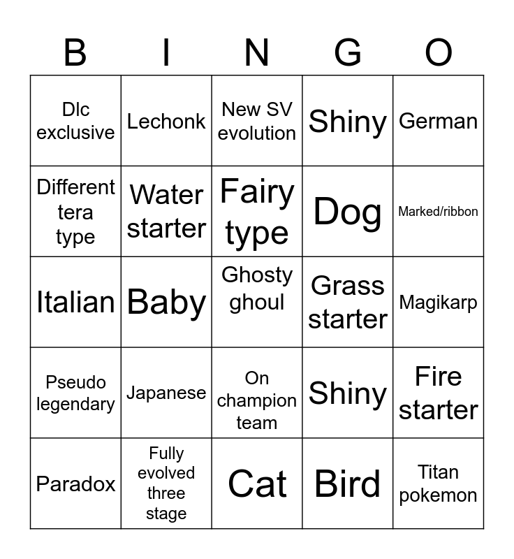 This bingo card has a free space and 24 words: Japanese, Fully evolved three stage, Fairy type, Paradox, German, Dlc exclusive, Different tera type, Lechonk, Grass starter, On champion team, Dog, Italian, Shiny, Fire starter, Water starter, Bird, Magikarp, New SV evolution, Marked/ribbon, Baby, Titan pokemon, Pseudo legendary, Shiny and Cat.