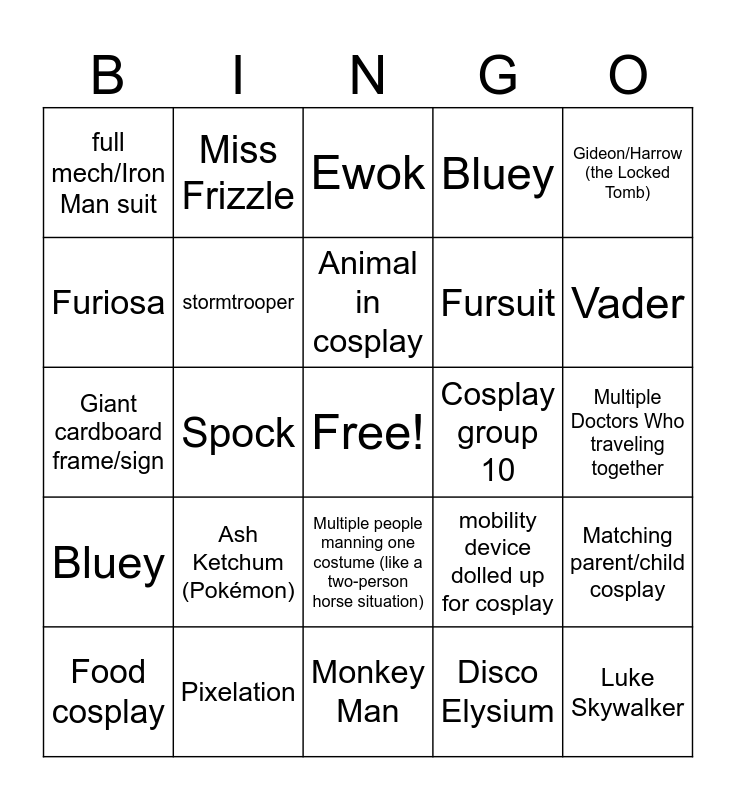 This bingo card has a free space and 48 words: Senshi (dungeon meshi), Luke Skywalker, Chel (Portal), Monkey Man, Ash Ketchum (Pokémon), Barbie, Miss Frizzle, Ray-Gun (Olympics), Furiosa, Dementus (furiosa), stormtrooper, Bluey, Matching parent/child cosplay, mobility device dolled up for cosplay, Katamari cousins, Cosplay medic, Animal in cosplay, Cosplay group 10, Pride flag remix cosplay, Gideon/Harrow (the Locked Tomb), Spock, Disco Elysium, full mech/Iron Man suit, Fursuit, Spider punk, Vader, Food cosplay, costume that can quick change/transform, Multiple people manning one costume (like a two-person horse situation), Bluey, Katamari cousins, Cosplay group of 10+ people, Sexy Pokémon, Stilts, Pixelation, Providing their own entrance music, Vegeta, Multiple Doctors Who traveling together, EL wires, Taako (the adventure zone), Warhammer Suit, beer wizard with a staff taller than the wizard, Ewok, Panelist in cosplay, Giant cardboard frame/sign, Snufkin (Moomins), Simpsons character not within the Simpson’s family and Welcome to Night Vale.
