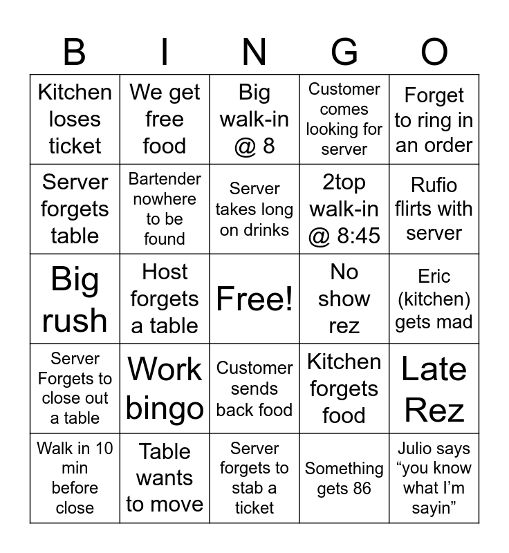 This bingo card has a free space and 25 words: Work bingo, Server forgets to stab a ticket, Server takes long on drinks, Walk in 10 min before close, Forget to ring in an order, Kitchen loses ticket, Server forgets table, We get free food, No show rez, Customer sends back food, 2top walk-in @ 8:45, Big rush, Kitchen forgets food, Late Rez, Bartender nowhere to be found, Customer hates drink, Eric (kitchen) gets mad, Big walk-in @ 8, Rufio flirts with server, Host forgets a table, Julio says “you know what I’m sayin”, Table wants to move, Server Forgets to close out a table, Customer comes looking for server and Something gets 86.