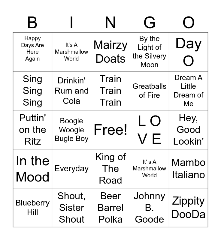 This bingo card has a free space and 31 words: Beer Barrel Polka, That's Amore, Boogie Woogie Bugle Boy, Mr. Sandman, Happy Days Are Here Again, Mairzy Doats, Drinkin' Rum and Cola, It' s A Marshmallow World, L O V E, Johnny B. Goode, Hey, Good Lookin', Zippity DooDa, It's A Lovely Day Today, Chatanooga Choo Choo, Dream A Little Dream of Me, Everybody Love's My Baby, Mambo Italiano, Everyday, In the Mood, King of The Road, Day O, You're 16, Blueberry Hill, It's A Marshmallow World, Greatballs of Fire, Sing Sing Sing, By the Light of the Silvery Moon, Puttin' on the Ritz, Shout, Sister Shout, Train Train Train and Don't Fence Me In.