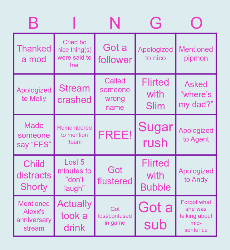 This bingo card has a free space and 24 words: Lost 5 minutes to "don't laugh", Actually took a drink, Called someone wrong name, Mentioned Alexx's anniversary stream, Mentioned pipmon, Thanked a mod, Apologized to Melly, Cried bc nice thing(s) were said to her, Sugar rush, Got flustered, Flirted with Slim, Made someone say “FFS”, Flirted with Bubble, Apologized to Andy, Stream crashed, Got a sub, Apologized to Agent, Got a follower, Asked “where’s my dad?”, Remembered to mention !team, Forgot what she was talking about mid-sentence, Child distracts Shorty, Apologized to nico and Got lost/confused in game.