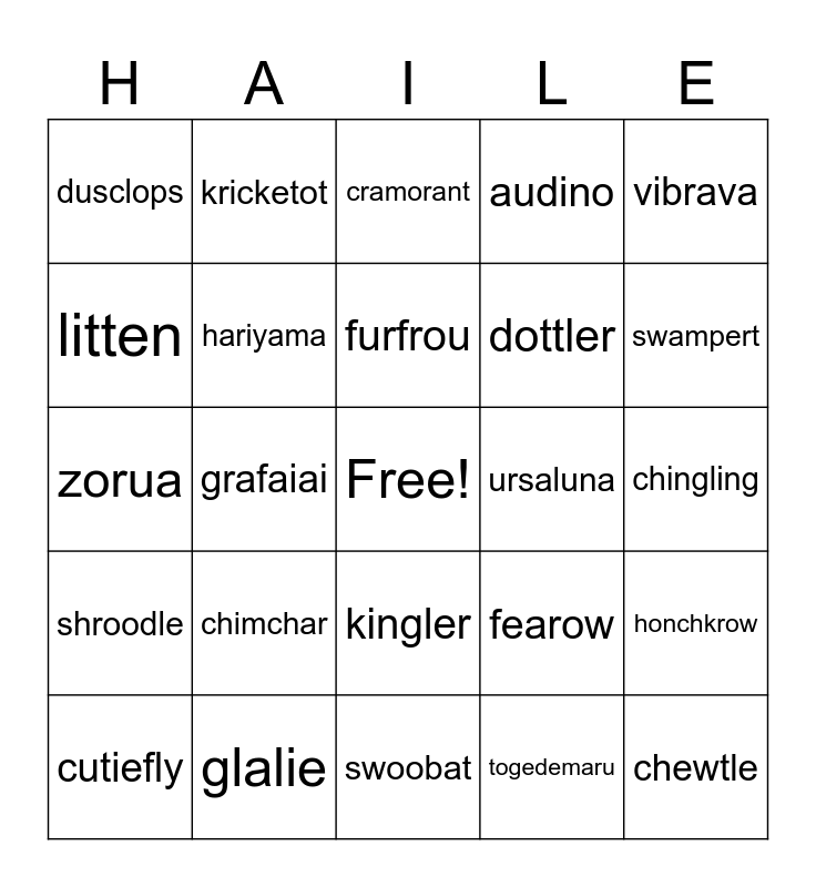 This bingo card has a free space and 24 words: chimchar, glalie, furfrou, cutiefly, vibrava, dusclops, litten, kricketot, ursaluna, kingler, dottler, zorua, fearow, honchkrow, hariyama, togedemaru, chingling, cramorant, swampert, grafaiai, chewtle, shroodle, audino and swoobat.