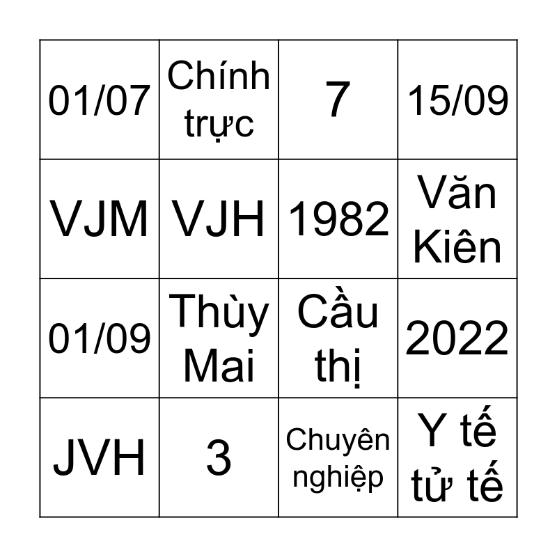 This bingo card has 16 words: 3, 2022, 7, 01/07, 01/09, Chính trực, Cầu thị, Chuyên nghiệp, VJM, VJH, JVH, 15/09, Thùy Mai, Văn Kiên, 1982 and Y tế tử tế.