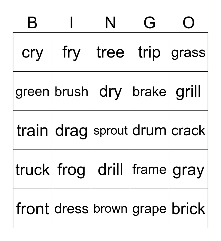 This bingo card has a free space and 24 words: frog, dress, dry, front, grass, cry, green, fry, drum, drill, brake, train, frame, gray, brush, grape, crack, tree, grill, drag, brick, truck, trip and brown.