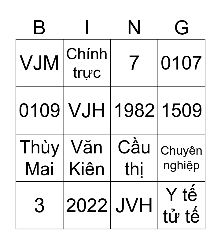 This bingo card has 16 words: 3, 2022, 7, 0107, 0109, Chính trực, Cầu thị, Chuyên nghiệp, VJM, VJH, JVH, 1509, Thùy Mai, Văn Kiên, 1982 and Y tế tử tế.