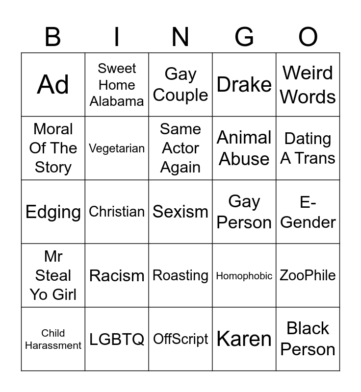 This bingo card has a free space and 24 words: Racism, LGBTQ, Same Actor Again, Child Harassment, Weird Words, Ad, Moral Of The Story, Sweet Home Alabama, Gay Person, Roasting, Animal Abuse, Edging, Homophobic, ZooPhile, Vegetarian, Karen, E-Gender, Gay Couple, Dating A Trans, Christian, Black Person, Mr Steal Yo Girl, Drake and OffScript.