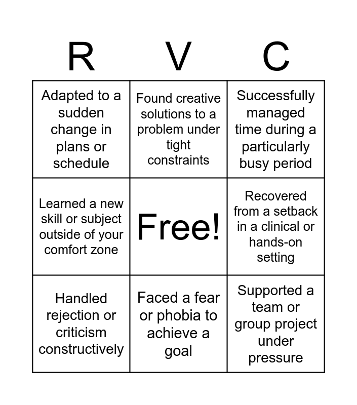 This bingo card has a free space and 10 words: Faced a fear or phobia to achieve a goal, Successfully managed time during a particularly busy period, Adapted to a sudden change in plans or schedule, Supported a team or group project under pressure, Learned a new skill or subject outside of your comfort zone, Handled rejection or criticism constructively, Found creative solutions to a problem under tight constraints, Persisted in a situation where others gave up, Recovered from a setback in a clinical or hands-on setting and Engaged in self-care during a stressful time.