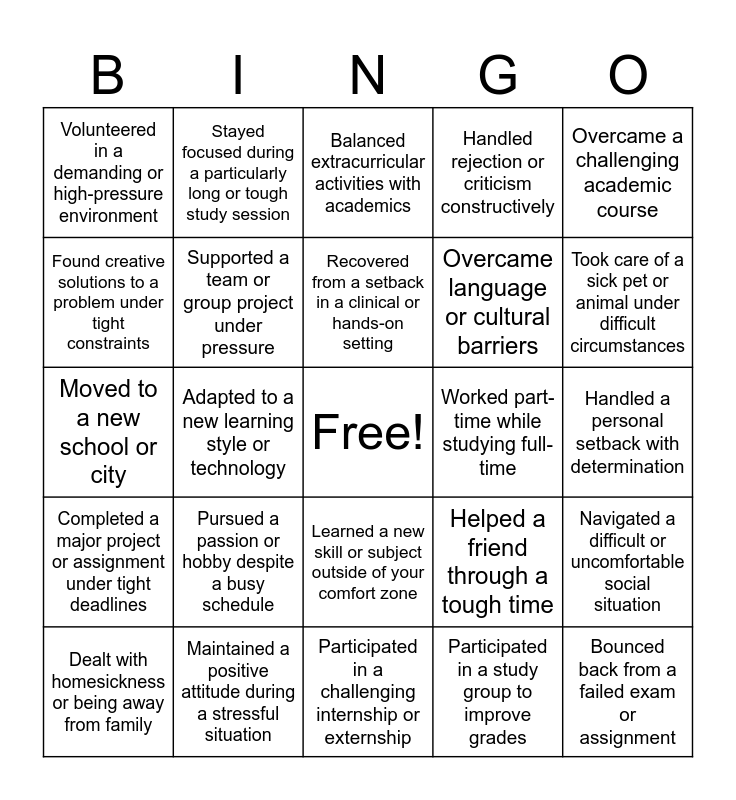 This bingo card has a free space and 35 words: Faced a fear or phobia to achieve a goal, Successfully managed time during a particularly busy period, Adapted to a sudden change in plans or schedule, Supported a team or group project under pressure, Learned a new skill or subject outside of your comfort zone, Handled rejection or criticism constructively, Found creative solutions to a problem under tight constraints, Persisted in a situation where others gave up, Recovered from a setback in a clinical or hands-on setting, Engaged in self-care during a stressful time, Moved to a new school or city, Overcame a challenging academic course, Handled a difficult conversation with a peer or teacher, Coped with a personal or family crisis, Volunteered in a demanding or high-pressure environment, Worked part-time while studying full-time, Participated in a study group to improve grades, Adapted to a new learning style or technology, Completed a major project or assignment under tight deadlines, Bounced back from a failed exam or assignment, Helped a friend through a tough time, Dealt with homesickness or being away from family, Navigated a difficult or uncomfortable social situation, Maintained a positive attitude during a stressful situation, Balanced extracurricular activities with academics, Took care of a sick pet or animal under difficult circumstances, Persevered through an injury or illness, Managed a leadership role in a club or organization, Overcame language or cultural barriers, Handled a personal setback with determination, Learned from constructive criticism or feedback, Participated in a challenging internship or externship, Pursued a passion or hobby despite a busy schedule, Stayed focused during a particularly long or tough study session and Supported a fellow student through a difficult experience.
