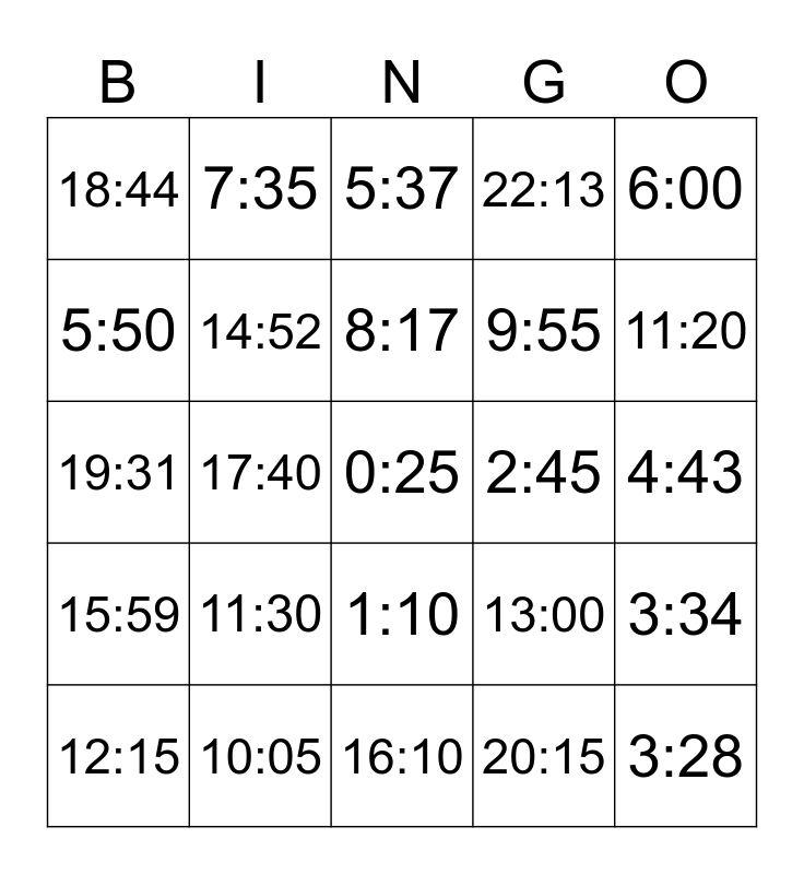 This bingo card has 25 words: 11:30, 16:10, 8:17, 12:15, 6:00, 18:44, 5:50, 7:35, 2:45, 1:10, 9:55, 19:31, 13:00, 3:34, 14:52, 3:28, 4:43, 5:37, 11:20, 17:40, 0:25, 10:05, 15:59, 22:13 and 20:15.