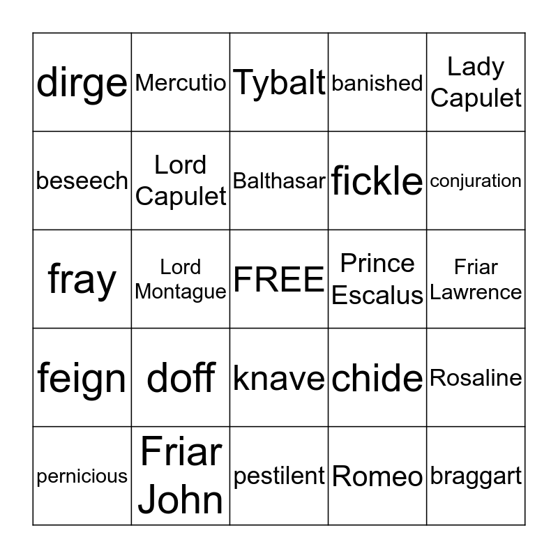 This bingo card has a free space and 32 words: Romeo, Juliet, Lord Montague, Lady Montague, feign, Lord Capulet, Lady Capulet, Rosaline, Mercutio, Benvolio, Balthasar, Tybalt, The Nurse, Paris, Prince Escalus, William Shakespeare, pernicious, fray, knave, doff, chide, sententious, Friar Lawrence, Friar John, braggart, banished, fickle, beseech, dirge, pestilent, apothecary and conjuration.