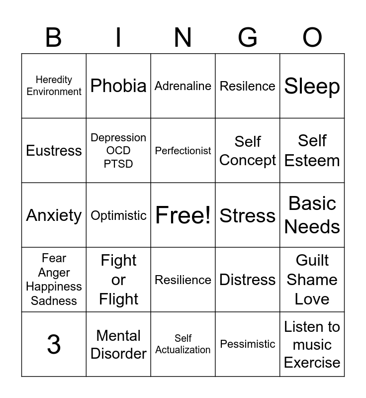 This bingo card has a free space and 24 words: Fight or Flight, Mental Disorder, Perfectionist, 3, Sleep, Heredity Environment, Eustress, Phobia, Stress, Resilience, Self Concept, Anxiety, Distress, Guilt Shame Love, Depression OCD PTSD, Pessimistic, Basic Needs, Adrenaline, Self Esteem, Optimistic, Listen to music Exercise, Fear Anger Happiness Sadness, Resilence and Self Actualization.