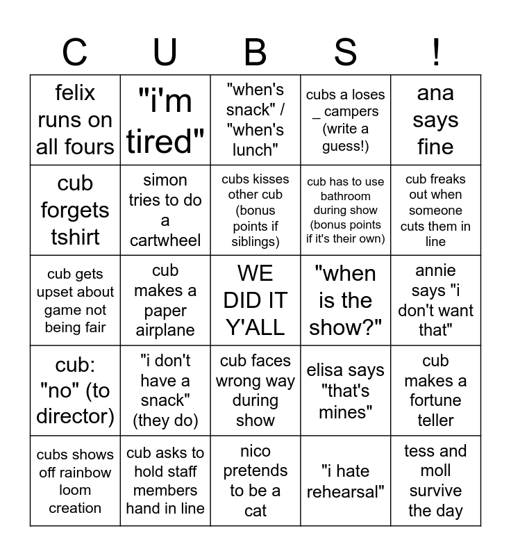 This bingo card has a free space and 34 words: cubs give elliot fashion advice, "i hate rehearsal", cubs d boys try to take shirts off, beatrice hides in a corner, cub: "no" (to director), simon tries to do a cartwheel, ana says fine, cubs shows off rainbow loom creation, "i'm tired", "i'm bored", cubs kisses other cub (bonus points if siblings), "when's snack" / "when's lunch", elisa asks to take shoes off, cub asks enby/gnc staff member if they're a boy/girl?, "when is the show?", cub freaks out when someone cuts them in line, cub asks to hold staff members hand in line, cub gets upset about game not being fair, "i don't have a snack" (they do), elisa says "that's mines", cub faces wrong way during show, cub needs to refill water, felix runs on all fours, annie says "i don't want that", nico pretends to be a cat, tess and moll survive the day, cubs a loses _ campers (write a guess!), cub sings along during other group's show, cub has to use bathroom during show (bonus points if it's their own), cub forgets tshirt, cub makes a paper fan, cub makes a paper airplane, cub makes a fortune teller and cub improv-s a line during show.