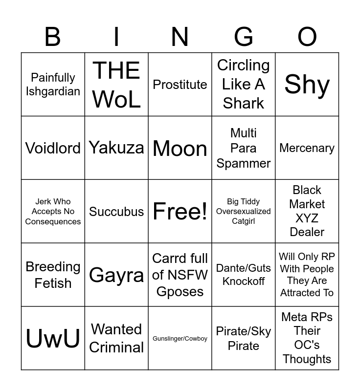 This bingo card has a free space and 24 words: Gayra, Wanted Criminal, Moon, UwU, Shy, Painfully Ishgardian, Voidlord, THE WoL, Big Tiddy Oversexualized Catgirl, Carrd full of NSFW Gposes, Multi Para Spammer, Jerk Who Accepts No Consequences, Dante/Guts Knockoff, Will Only RP With People They Are Attracted To, Yakuza, Pirate/Sky Pirate, Black Market XYZ Dealer, Prostitute, Mercenary, Succubus, Meta RPs Their OC's Thoughts, Breeding Fetish, Circling Like A Shark and Gunslinger/Cowboy.