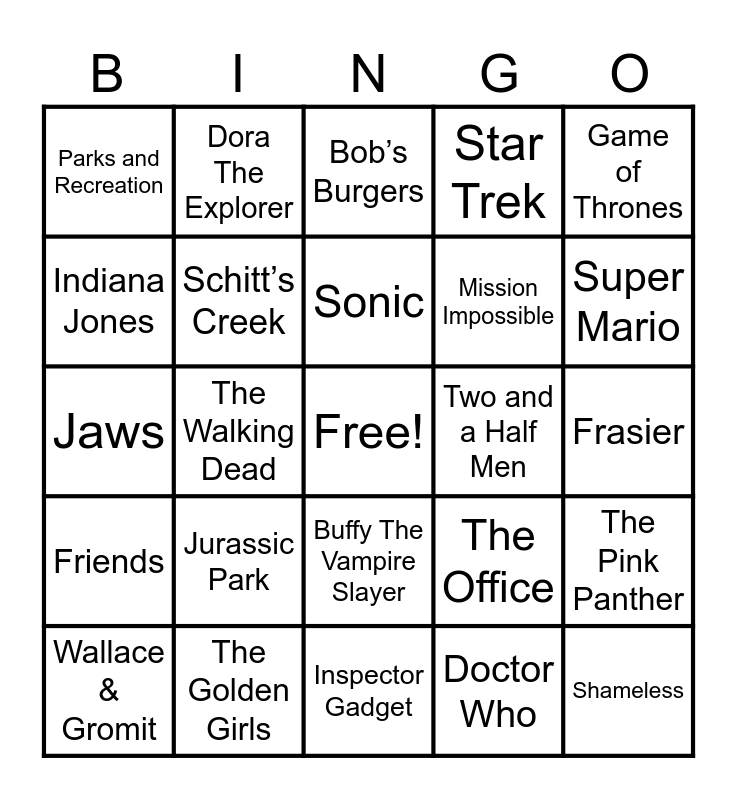 This bingo card has a free space and 39 words: VeggieTales, Jeopardy, Family Guy, Schitt’s Creek, Wallace & Gromit, Buffy The Vampire Slayer, Sonic, The Twilight Zone, Game of Thrones, Friends, The Walking Dead, Star Trek, Shameless, Frasier, Two and a Half Men, Jurassic Park, Toy Story, Parks and Recreation, Happy Days, The Office, Indiana Jones, Inspector Gadget, Mission Impossible, Super Mario, Murdoch Mysteries, Spongebob SquarePants, Men In Black, How To Train Your Dragon, Mister Rogers’ Neighbourhood, Dora The Explorer, Fraggle Rock, M.A.S.H, Bob’s Burgers, The Golden Girls, Doctor Who, Law & Order, The Pink Panther, Jaws and The Jetsons.