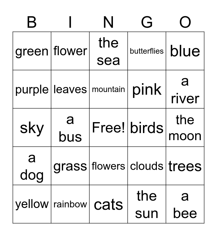 This bingo card has a free space and 24 words: grass, rainbow, mountain, yellow, blue, green, purple, flower, birds, flowers, pink, sky, clouds, trees, leaves, the sun, the moon, the sea, a river, a bus, a bee, a dog, butterflies and cats.