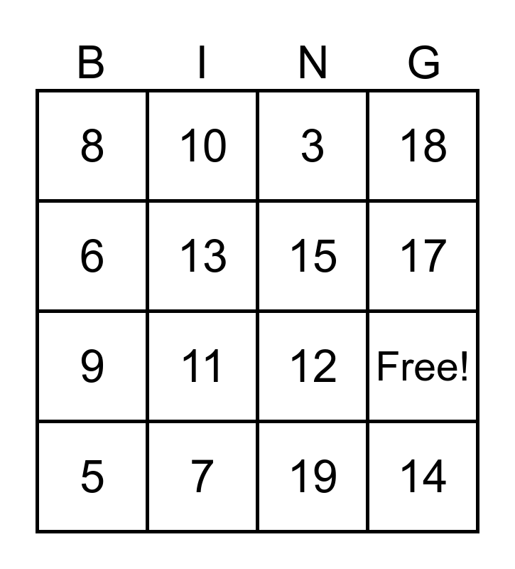 This bingo card has 20 words: Free!, 2, 3, 4, 5, 6, 7, 8, 9, 10, 11, 12, 13, 14, 15, 16, 17, 18, 19 and 20.
