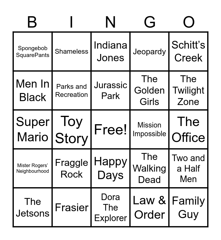 This bingo card has a free space and 39 words: Wallace & Gromit, Friends, How To Train Your Dragon, Parks and Recreation, The Jetsons, Happy Days, Jurassic Park, Star Trek, Schitt’s Creek, Mister Rogers’ Neighbourhood, Toy Story, Jeopardy, Family Guy, The Office, Mission Impossible, Fraggle Rock, Game of Thrones, Spongebob SquarePants, Murdoch Mysteries, The Walking Dead, Men In Black, Dora The Explorer, The Golden Girls, The Twilight Zone, Inspector Gadget, Buffy The Vampire Slayer, M.A.S.H, Bob’s Burgers, VeggieTales, Shameless, Sonic, Doctor Who, Indiana Jones, Frasier, Law & Order, Jaws, Two and a Half Men, Super Mario and The Pink Panther.