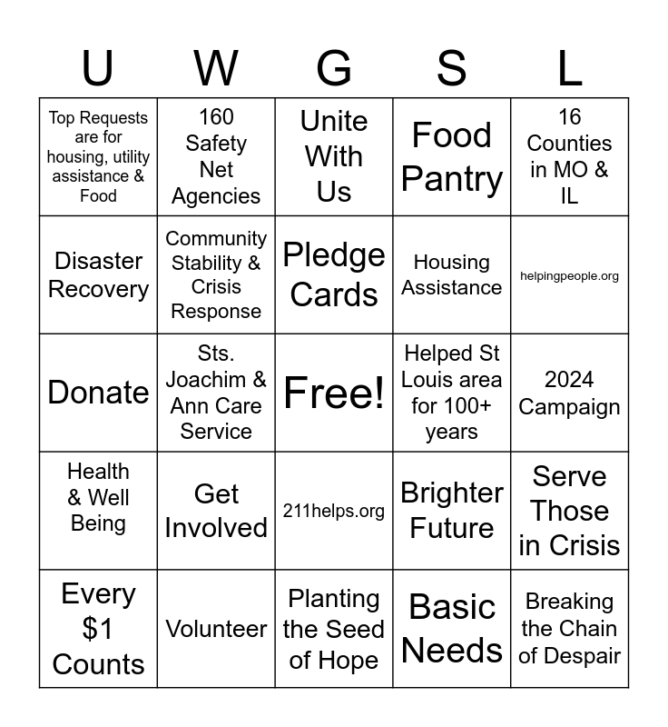 This bingo card has a free space and 34 words: 2-1-1, Basic Needs, Jobs & Financial Mobility, Early Childhood & Youth Success, Health & Well Being, Community Stability & Crisis Response, 16 Counties in MO & IL, Every $1 Counts, 160 Safety Net Agencies, Helps 1 in 3 People, Pledge Cards, Unite With Us, Watch. Enter.Win, Helping People Live Their Best Possible Lives, Helped St Louis area for 100+ years, helpingpeople.org, Volunteer, Donate, Get Involved, Brighter Future, 211helps.org, United Impact, Top Requests are for housing, utility assistance & Food, 2024 Campaign, Planting the Seed of Hope, Breaking the Chain of Despair, Food Pantry, Street Outreach, Housing Assistance, Disaster Recovery, Children & Family Development, Sts. Joachim & Ann Care Service, Serve Those in Crisis and Prevent Homelessness & Hunger.