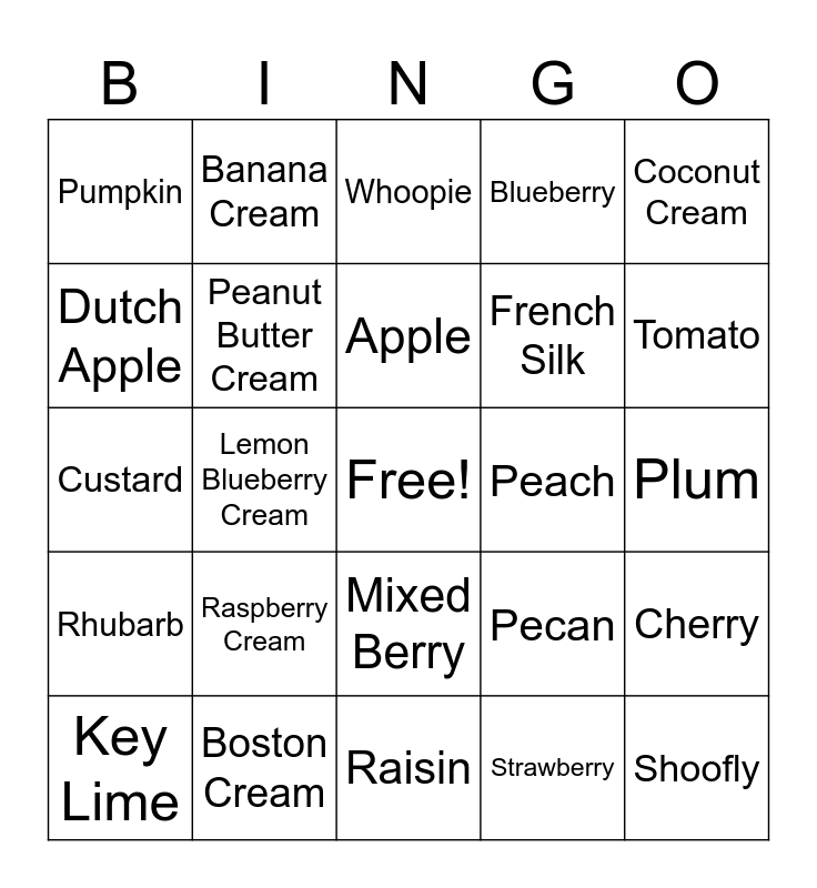 This bingo card has a free space and 24 words: Raspberry Cream, Boston Cream, Apple, Key Lime, Coconut Cream, Pumpkin, Dutch Apple, Banana Cream, Peach, Mixed Berry, French Silk, Custard, Pecan, Cherry, Peanut Butter Cream, Strawberry, Plum, Whoopie, Tomato, Lemon Blueberry Cream, Shoofly, Rhubarb, Blueberry and Raisin.