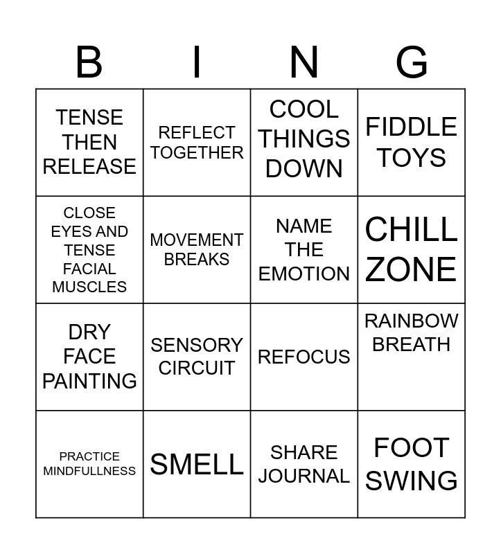 This bingo card has 16 words: SMELL, RAINBOW BREATH, COOL THINGS DOWN, TENSE THEN RELEASE, DRY FACE PAINTING, REFLECT TOGETHER, REFOCUS, SHARE JOURNAL, CLOSE EYES AND TENSE FACIAL MUSCLES, MOVEMENT BREAKS, PRACTICE MINDFULLNESS, FIDDLE TOYS, SENSORY CIRCUIT, CHILL ZONE, NAME THE EMOTION and FOOT SWING.